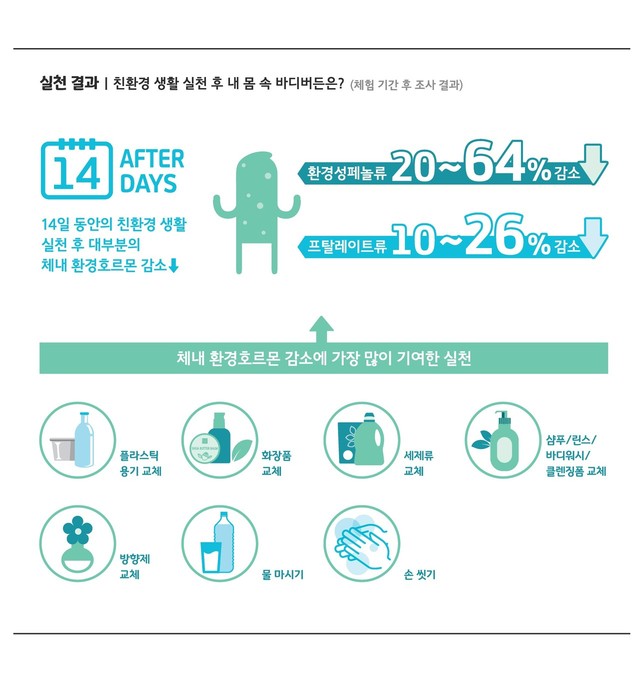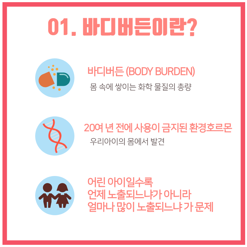 바로 우리 인체 내에 쌓여있는 화학물질과 평소 우리가 노출되어 있는 환경호르몬이 우리의 몸에 어떤 작용을 하는지 알아보고 이를 줄이는 방법입니다!