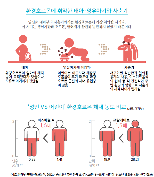 환경호르몬으로 인한 다낭성 난소 증후군과 불임과 난임, ADHD, 심지어 어린아이에게 나타나는 성조숙증까지 발생하게 된다고 하네요.